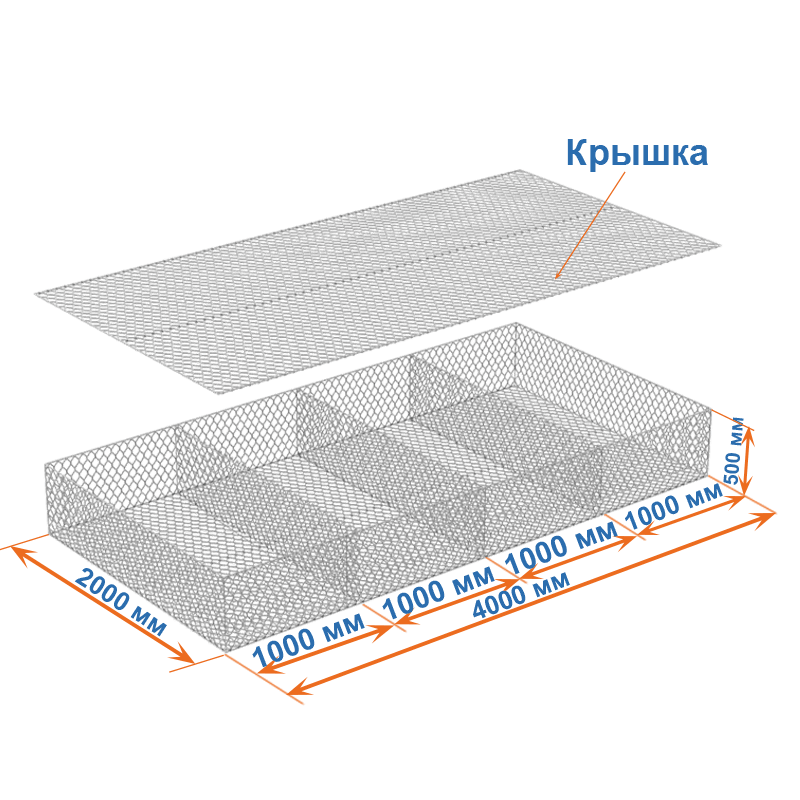 Матрасы Рено 4х2х0,5 — плоские габионные секции из сетки двойного кручения с ячейкой 60х80, проволокой 2,2 мм и покрытием Цинк.